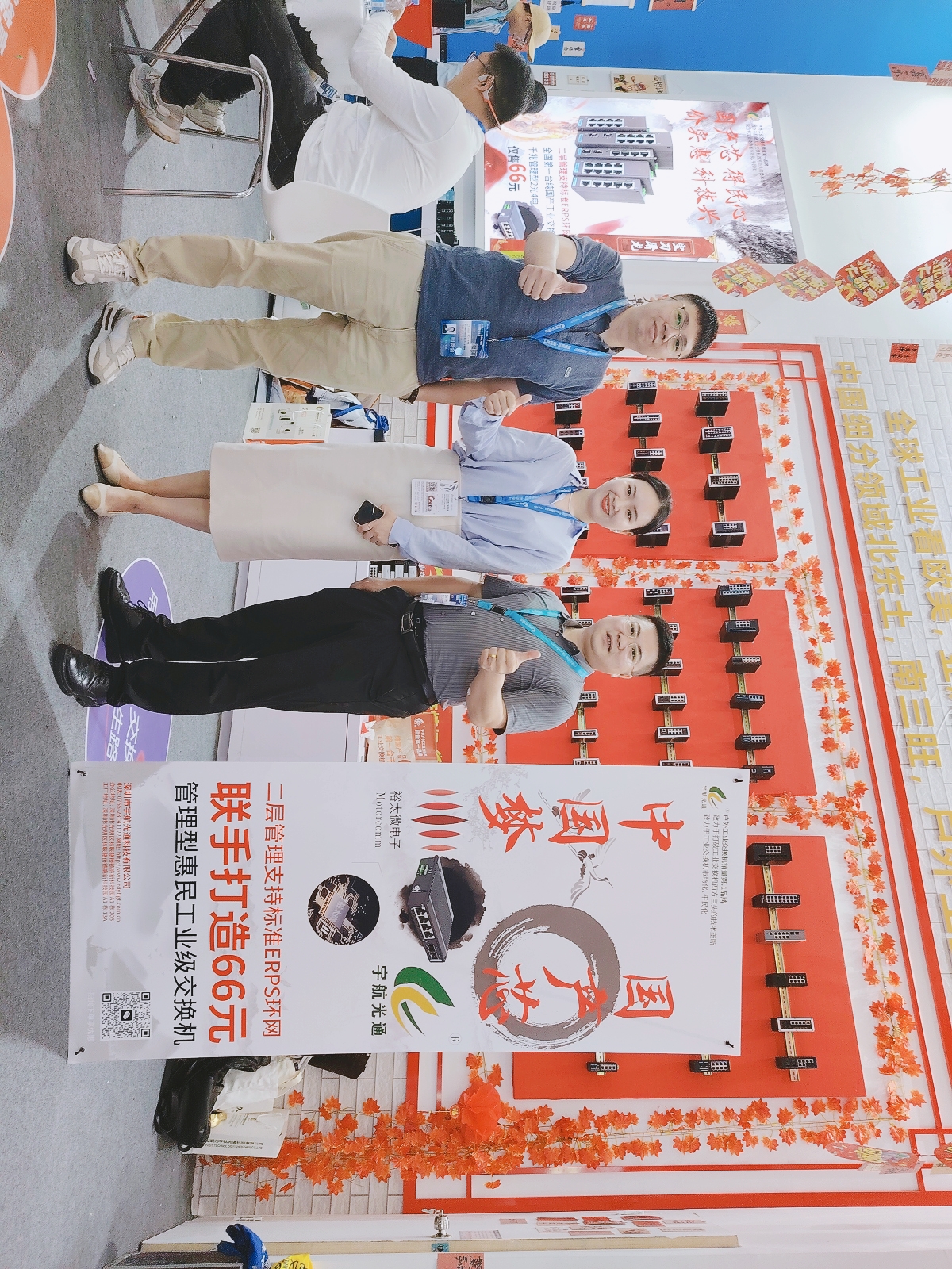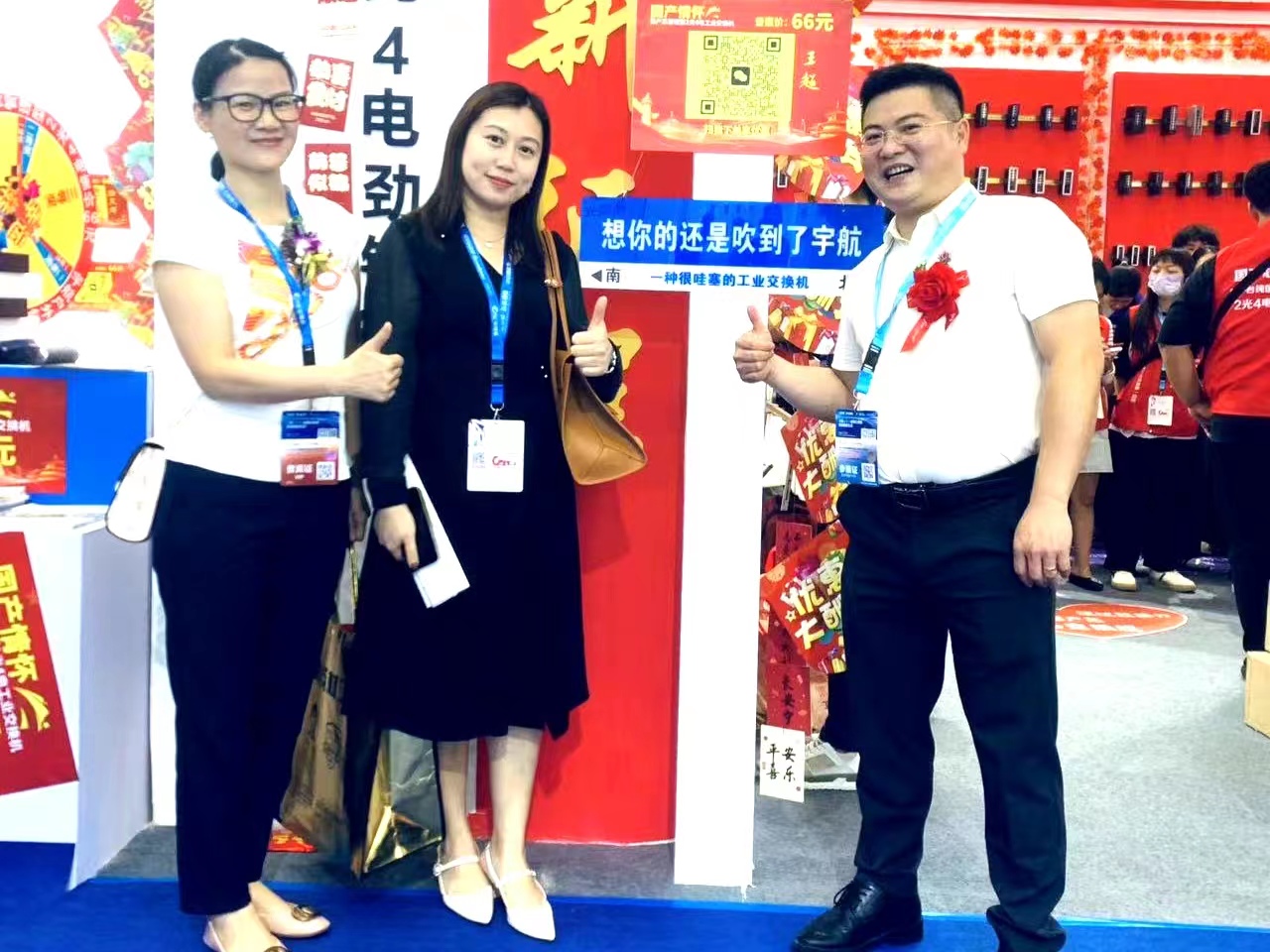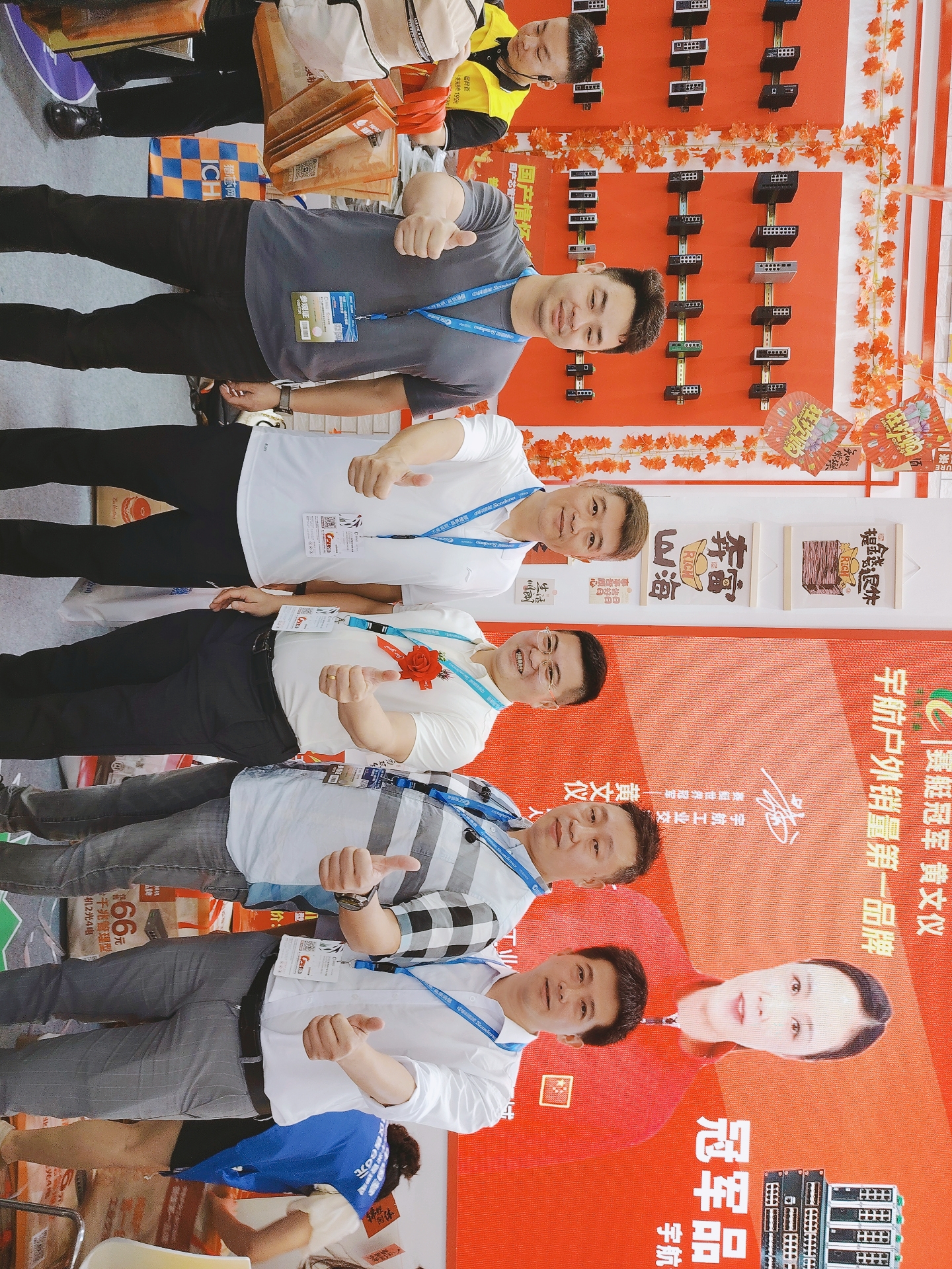 宇航工業(yè)交換機劉總受邀參加CPSE安博會開幕式(第二排左二) 宇航是戶外工業(yè)銷量第一品牌,本次展會宇航順應(yīng)潮流,以中國紅為背景,結(jié)合當(dāng)前“00后”慣用的網(wǎng)絡(luò)流行語來打造展館,兩種元素相互碰撞,獨具匠心,整個展館充滿活力和年輕氣息,吸引了眾多嘉賓駐足觀看,前來打卡留念的觀眾絡(luò)繹不絕。