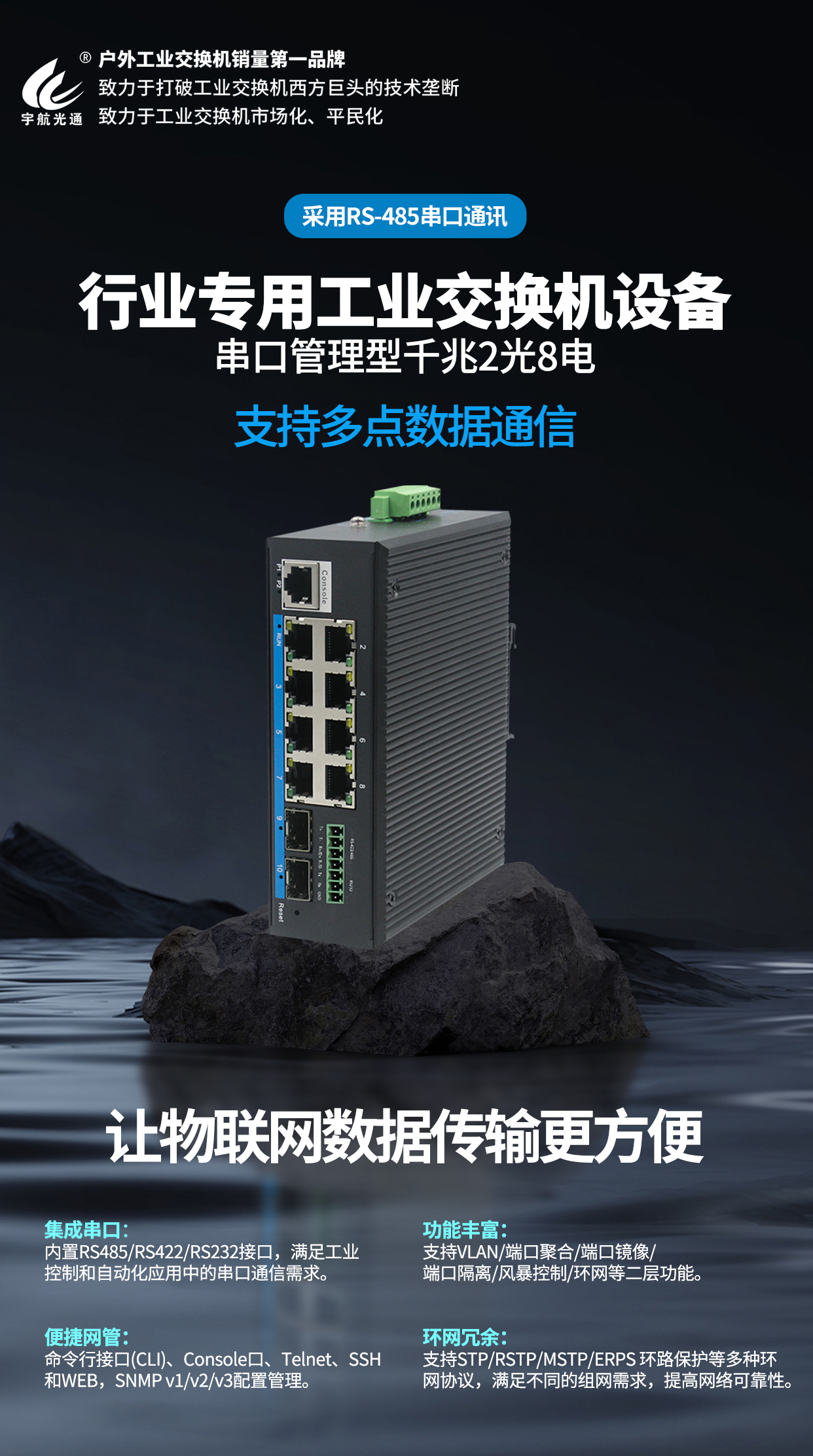 宇航2千光8千兆電+485工業交換機內置RS485/RS422/RS232接口,滿足工業控制和自動化應用中的串口通信需求,實現靈活的數據傳輸和控制。便捷的網絡管理功能讓用戶可以通過命令行接口進行配置和管理,實現高效的網絡監控和管理,滿足不同的網絡需求,提高網絡的可靠性和穩定性,有效地避免網絡故障。