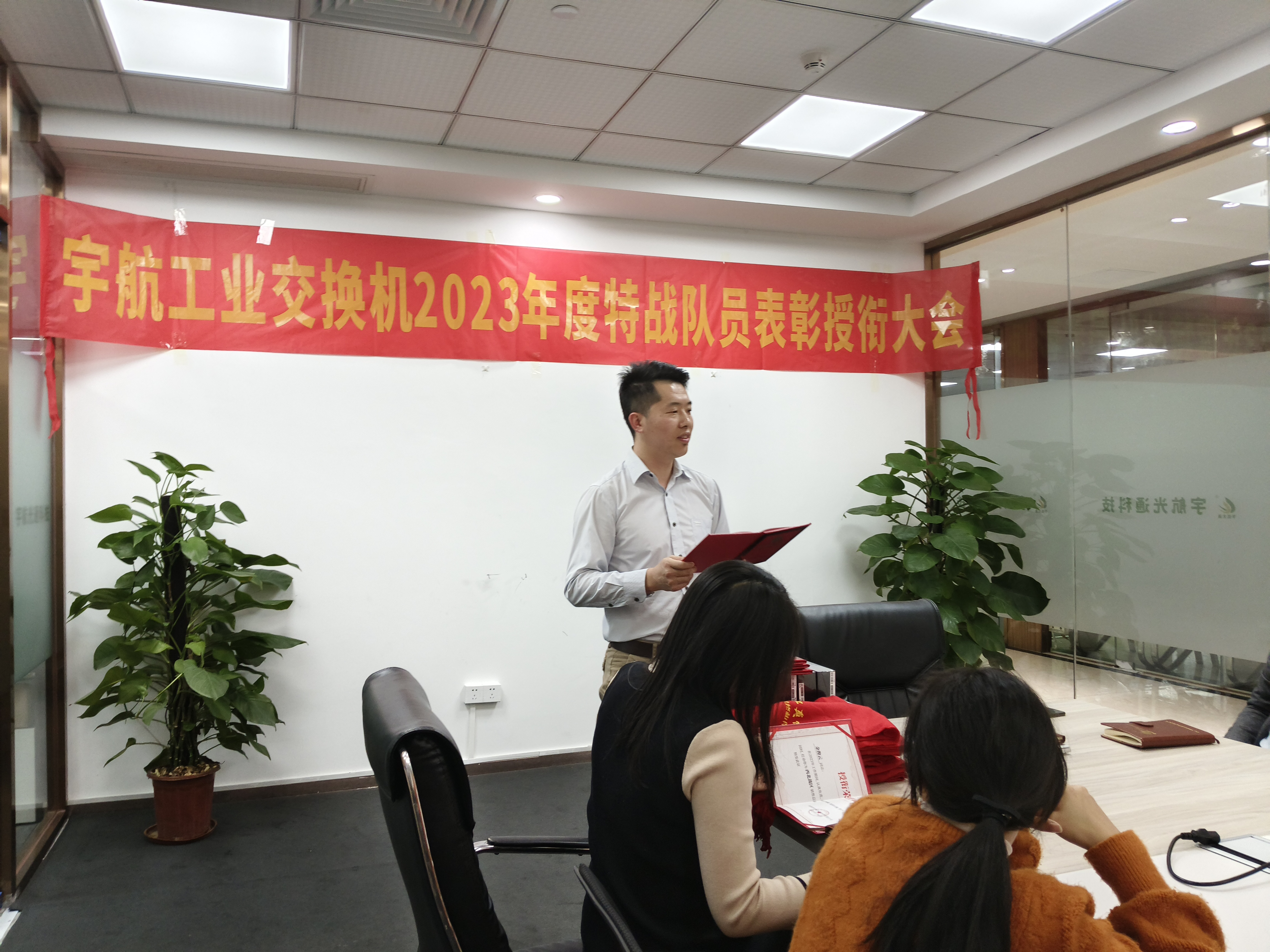 在充滿激情與活力的2023年,宇航工業交換機取得了令人矚目的成績。這些輝煌的成績并非偶然,源于每一位宇航人的辛勤付出與執著追求,更離不開每一位客戶的大力支持。為了表彰優秀、鼓勵先進,宇航工業交換機在1月5日舉行了銷冠表彰授銜儀式,為表現優秀的銷售頒發獎勵。