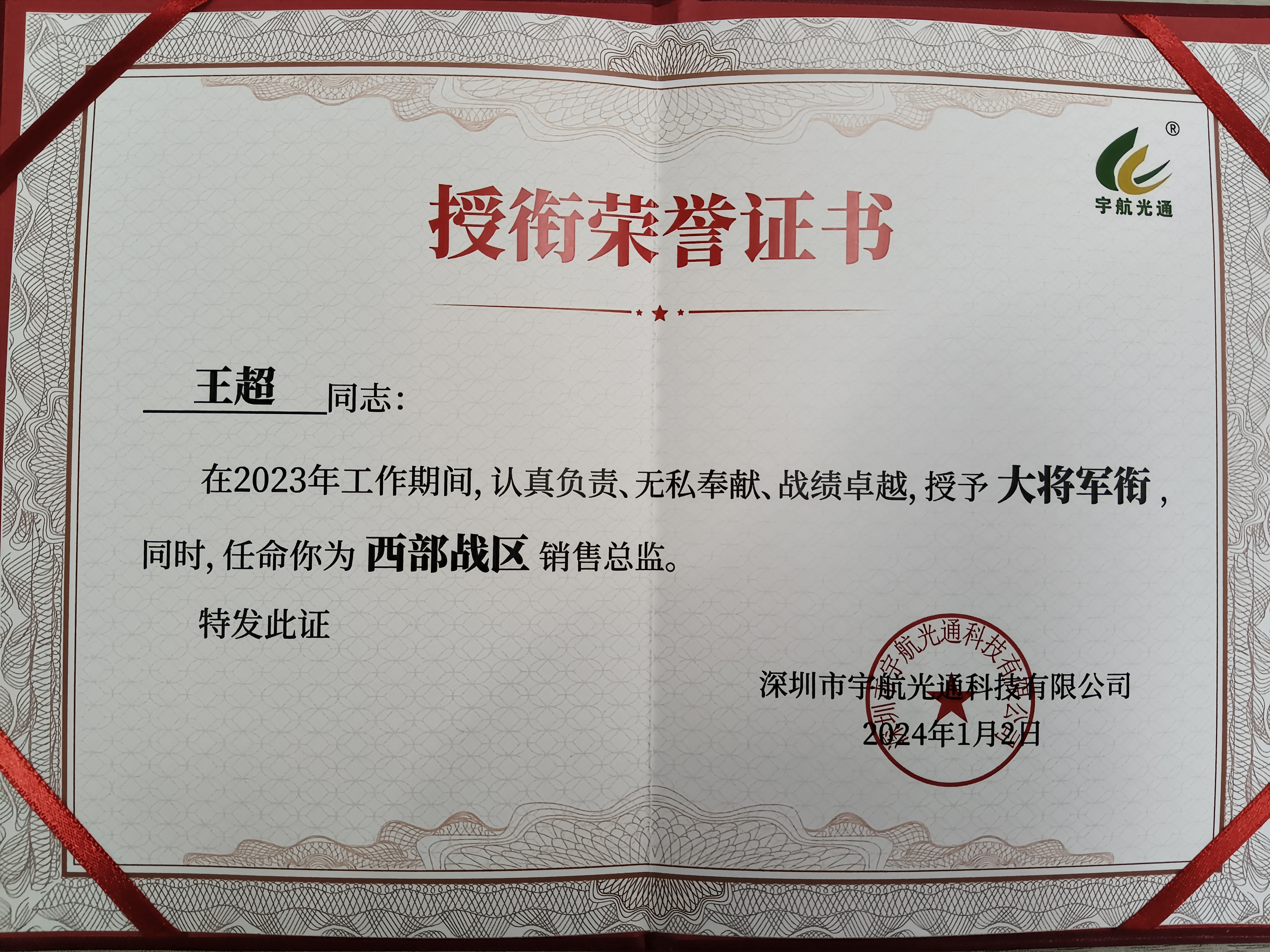 宇航工業交換機王超在2023年工作期間,憑借出色的工作表現和業績,授予“大將軍”銜,同時,任命為西部戰區銷售總監。