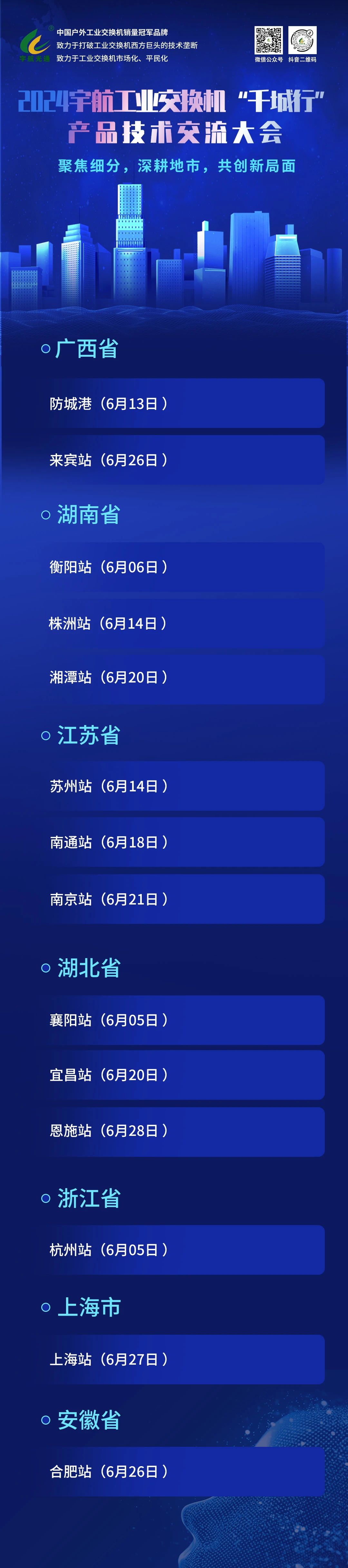 宇航,作為全國產(chǎn)工業(yè)交換機發(fā)起單位,隨著國產(chǎn)工業(yè)交換機的不斷推廣和普及,光通信行業(yè)正在迎來新的機遇。為了與各位友商及客戶朋友深入交流,6月份,宇航工業(yè)交換機將分別在浙江杭州、湖北襄陽、宜昌、恩施、江蘇蘇州、南通和南京、湖南衡陽、株洲和湘潭、廣西防城港和來賓、安徽合肥、上海以及泰國等國內外多個城市舉辦2024宇航工業(yè)交換機千城行產(chǎn)品技術交流大會;同時,在武漢、廣州、深圳等城市參加行業(yè)各大展會。