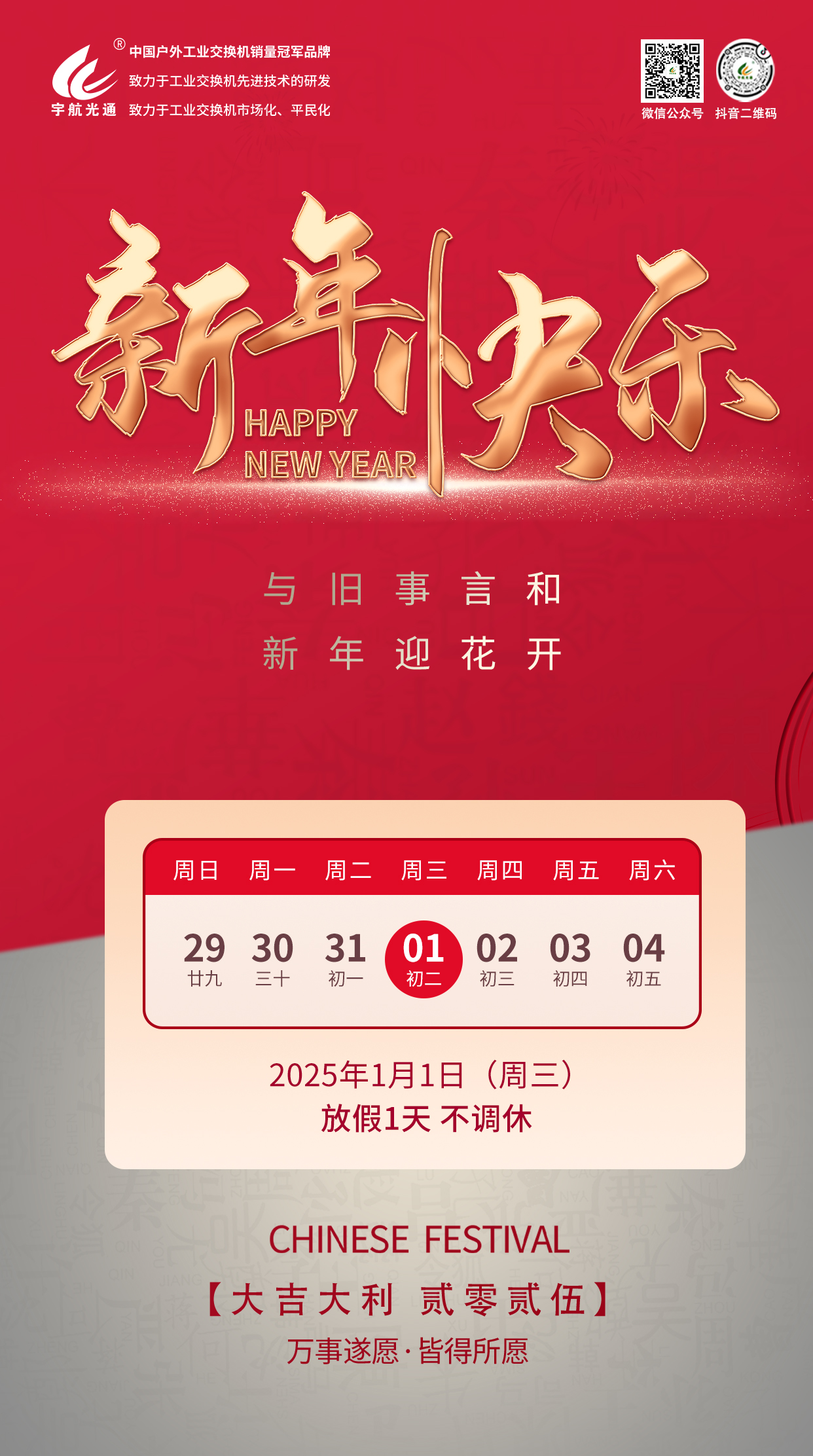 辭舊納新,共赴新程,預(yù)祝大家新年快樂(lè)。元旦放假時(shí)間:2025年1月1日(星期三),放假1天。