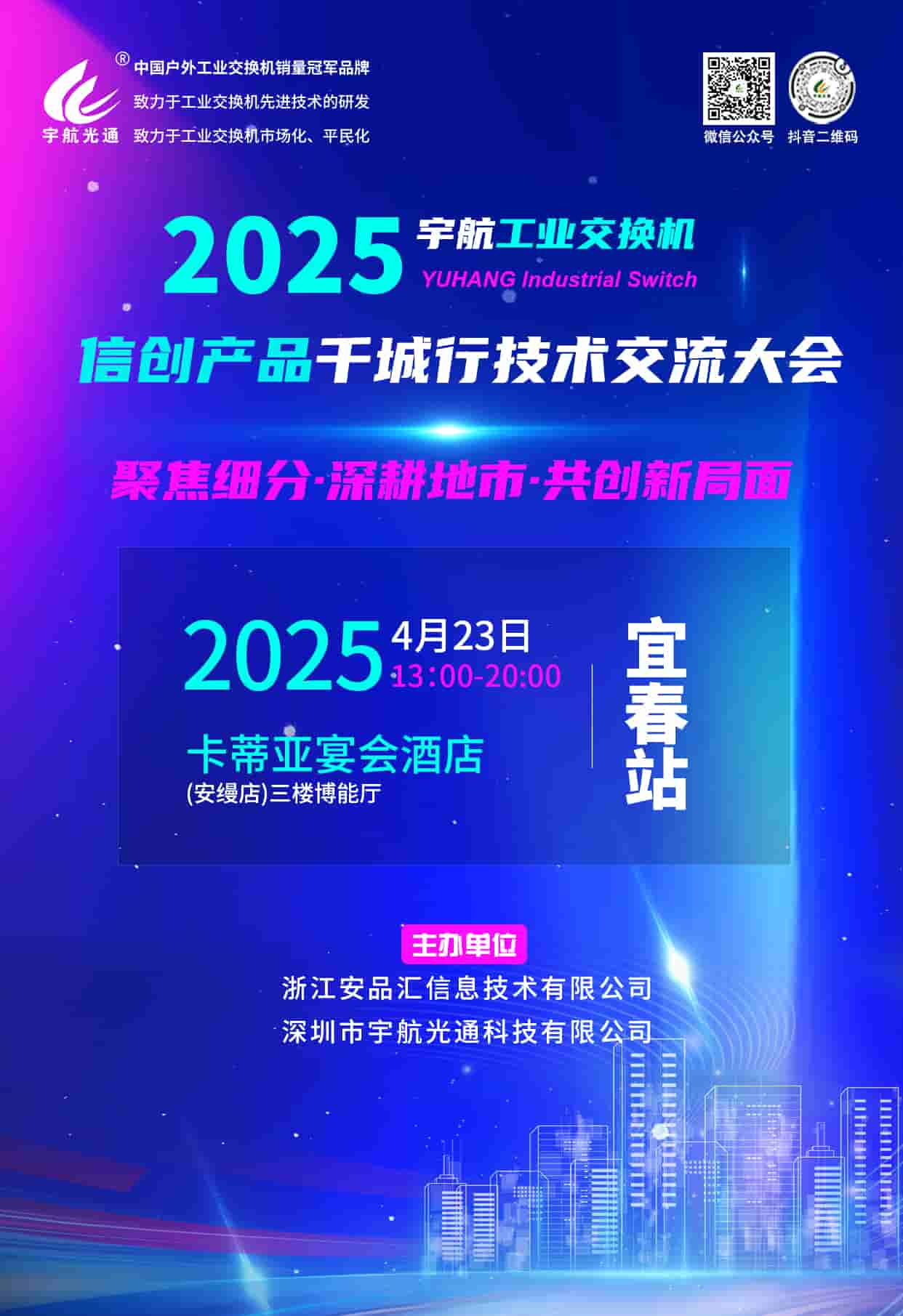 2025年4月15日至4月18日,宇航工業交換機作為中國戶外工業交換機銷量冠軍品牌,成功舉辦了2025信創產品千城行技術交流大會杭州站、南通站及贛州站活動。三地會議匯聚行業精英,深入探討信創產業發展與工業互聯新趨勢,展示了宇航在國產化替代領域的創新成果與技術優勢。與會嘉賓普遍反饋收獲頗豐,此次交流盛會不僅促進了區域產業協同,更為宇航品牌的全國化布局注入新動力,彰顯了民族品牌的創新活力與使命擔當。