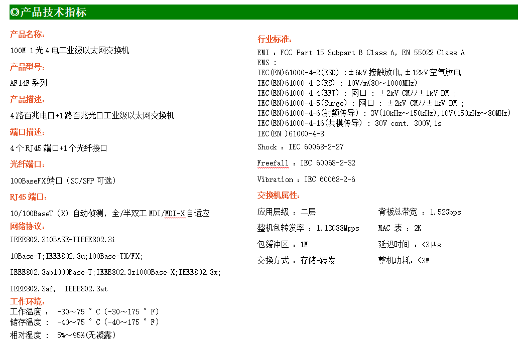 4路百兆電口+1路百兆SFP光口工業(yè)級以太網(wǎng)交換機,支持4個10Base-T/100Base-TX電口和1個100Base-X光口。產(chǎn)品符合FCC、CE、ROHS標(biāo)準(zhǔn)。AF14F系列交換機具有-30℃~75℃的工作溫度,具有超強的堅固度能適應(yīng)各種嚴(yán)苛環(huán)境,也可以非常方便的安置在空間緊湊的控制箱中。導(dǎo)軌的安裝特性、寬溫操作及擁有IP40防護等級的外殼及LED指示燈,使AF14F成為一個即插即用的工業(yè)級設(shè)備,為用戶的以太網(wǎng)設(shè)備聯(lián)網(wǎng)提供可靠、便捷的解決方案。