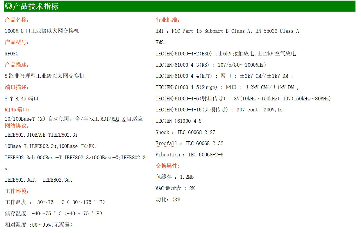 8路千兆電口工業(yè)級以太網(wǎng)交換機,支持8個10Base-T/100Base-T/1000Base-TX電口。產(chǎn)品符合FCC、CE、ROHS標(biāo)準(zhǔn)。AF08G交換機具有-30℃~75℃的工作溫度,具有超強的堅固度能適應(yīng)各種嚴(yán)苛環(huán)境,也可以非常方便的安置在空間緊湊的控制箱中。導(dǎo)軌的安裝特性、寬溫操作及擁有IP40防護等級的外殼及LED指示燈,使AF08G成為一個即插即用的工業(yè)級設(shè)備,為用戶的以太網(wǎng)設(shè)備聯(lián)網(wǎng)提供可靠、便捷的解決方案。