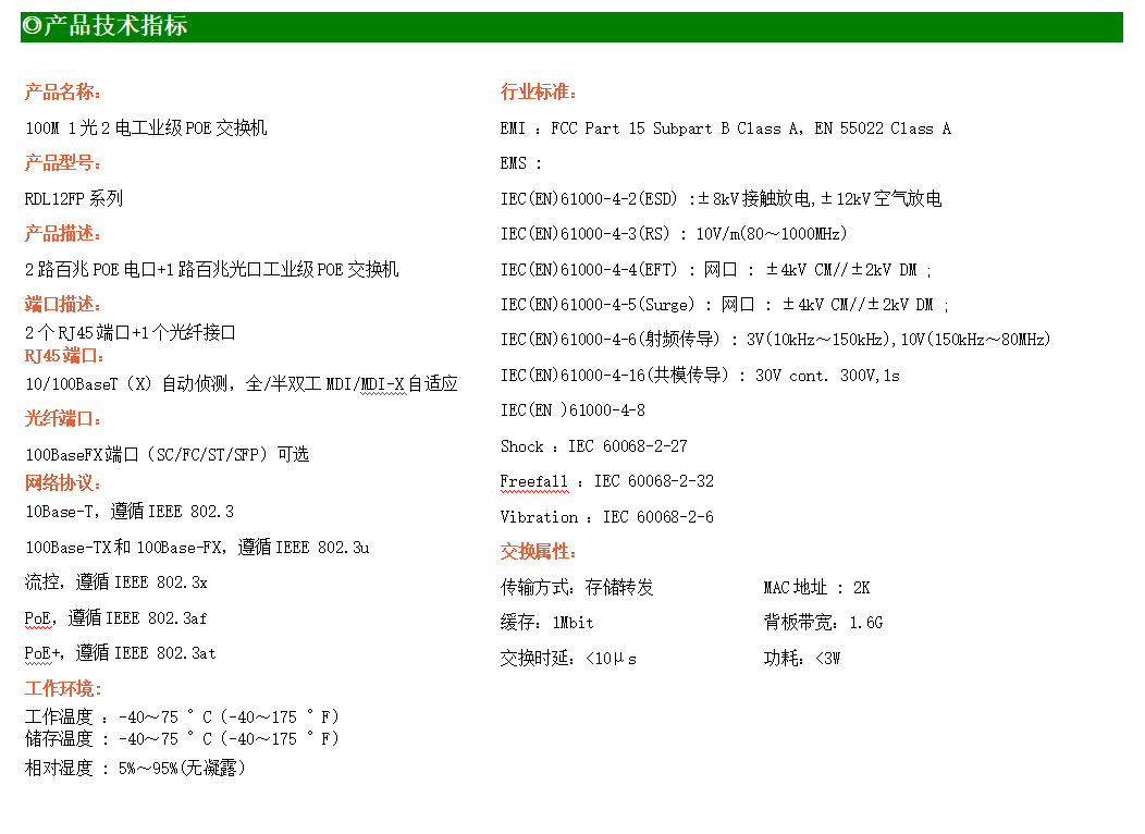 2路百兆POE電口+1路百兆SFP光口工業(yè)級以太網(wǎng)POE交換機,支持2個10/100Base-TX電口和1個100Base-X光口。產(chǎn)品符合FCC、CE、ROHS標準。RDL12FP系列交換機具有-40℃~75℃的工作溫度,具有超強的堅固度能適應(yīng)各種嚴苛環(huán)境,也可以非常方便的安置在空間緊湊的控制箱中。導(dǎo)軌的安裝特性、寬溫操作及擁有IP40防護等級的外殼及LED指示燈,使RDL12FP成為一個即插即用的工業(yè)級設(shè)備,為用戶的以太網(wǎng)設(shè)備聯(lián)網(wǎng)提供可靠、便捷的解決方案。