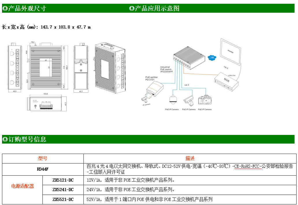 4路百兆電口+4路百兆光口工業級以太網交換機,支持4個10Base-T/100Base-TX電口和4個100Base-SFP光口。產品符合FCC、CE、ROHS標準。RD44F交換機具有-40℃~80℃的工作溫度,具有超強的堅固度能適應各種嚴苛環境,也可以非常方便的安置在空間緊湊的控制箱中。導軌的安裝特性、寬溫操作及擁有IP40防護等級的外殼及LED指示燈,使RD44F成為一個即插即用的工業級設備,為用戶的以太網設備聯網提供可靠、便捷的解決方案。