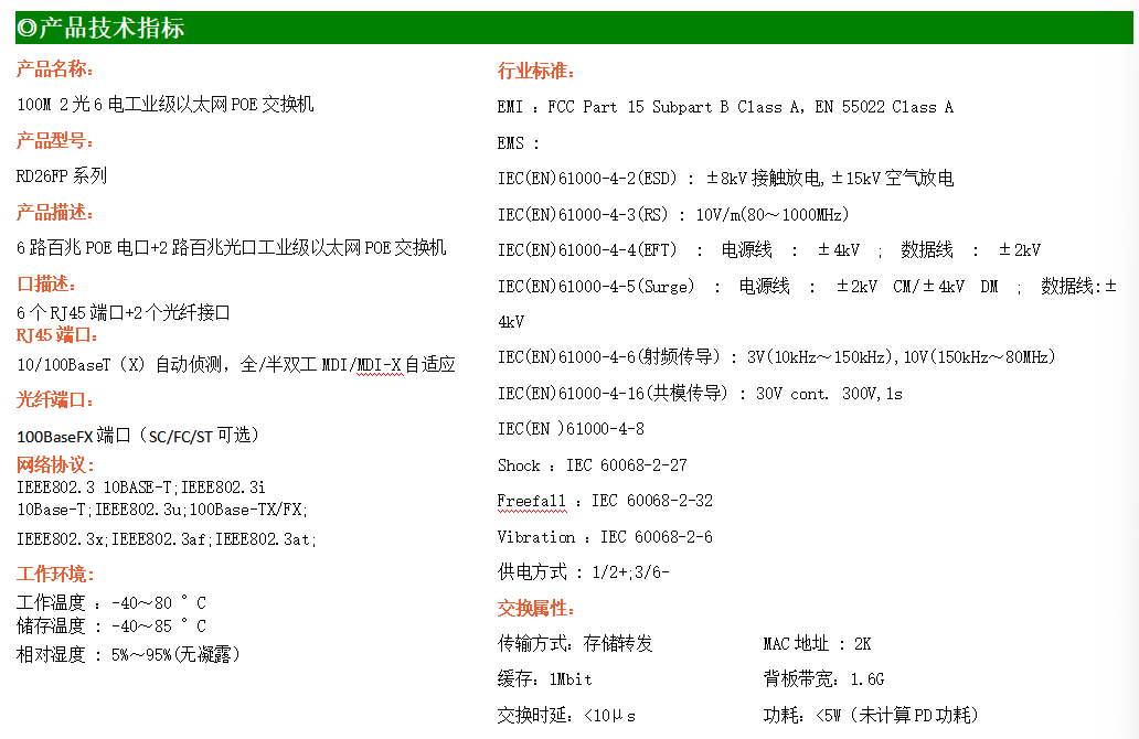 6路百兆POE電口+2路百兆FX光口工業級以太網交換機,支持6個10Base-T/100Base-TX電口和2個100Base-X光口。產品符合FCC、CE、ROHS標準。RD26FP系列交換機具有-40℃~80℃的工作溫度,具有超強的堅固度能適應各種嚴苛環境,也可以非常方便的安置在空間緊湊的控制箱中。導軌的安裝特性、寬溫操作及擁有IP40防護等級的外殼及LED指示燈,使RD26FP成為一個即插即用的工業級設備,為用戶的以太網設備聯網提供可靠、便捷的解決方案。