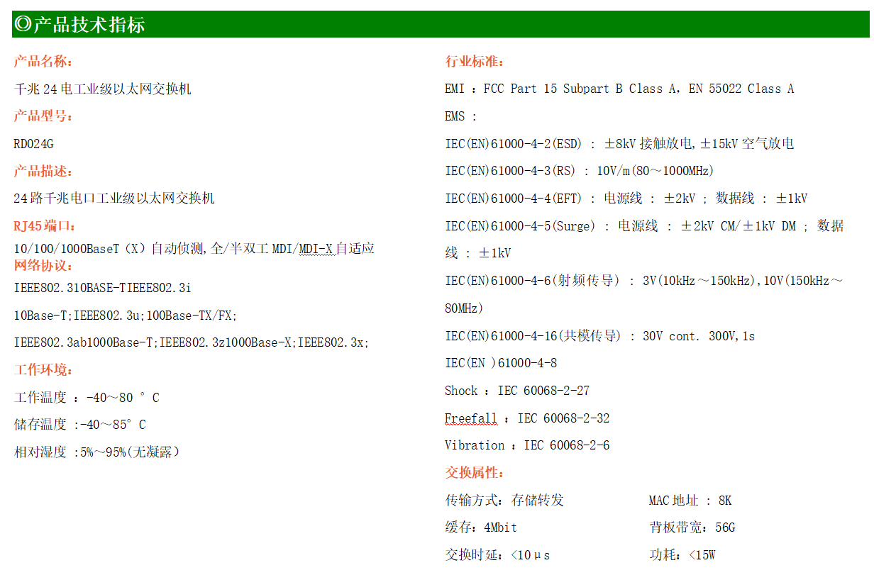 24路千兆電口工業(yè)級(jí)以太網(wǎng)交換機(jī),支持24個(gè)10Base-T/100Base-T/1000Base-TX電口。產(chǎn)品符合FCC、CE、ROHS標(biāo)準(zhǔn)。RD024G交換機(jī)具有-40℃~80℃的工作溫度,具有超強(qiáng)的堅(jiān)固度能適應(yīng)各種嚴(yán)苛環(huán)境,也可以非常方便的安置在空間緊湊的控制箱中。機(jī)架式安裝特性、寬溫操作及擁有IP40防護(hù)等級(jí)的外殼及LED指示燈,使RD224G-SFP成為一個(gè)即插即用的工業(yè)級(jí)設(shè)備,為用戶(hù)的以太網(wǎng)設(shè)備聯(lián)網(wǎng)提供可靠、便捷的解決方案。