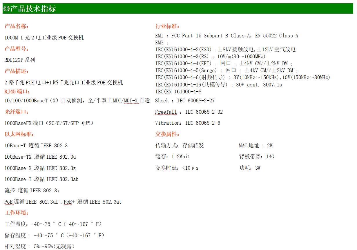 2路千兆POE電口+1路千兆FX光口工業(yè)級以太網(wǎng)POE交換機(jī),支持2個10/100/1000Base-TX電口和1個1000Base-X光口。產(chǎn)品符合FCC、CE、ROHS標(biāo)準(zhǔn)。RDL12GP系列交換機(jī)具有-40℃~75℃的工作溫度,具有超強(qiáng)的堅固度能適應(yīng)各種嚴(yán)苛環(huán)境,也可以非常方便的安置在空間緊湊的控制箱中。導(dǎo)軌的安裝特性、寬溫操作及擁有IP40防護(hù)等級的外殼及LED指示燈,使RDL12GP成為一個即插即用的工業(yè)級設(shè)備,為用戶的以太網(wǎng)設(shè)備聯(lián)網(wǎng)提供可靠、便捷的解決方案。