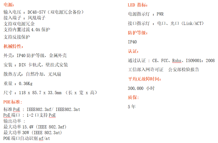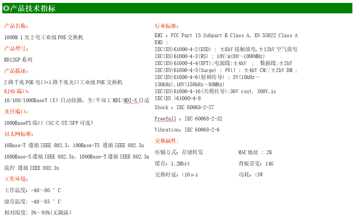 2路千兆POE電口+1路千兆FX光口工業(yè)級以太網(wǎng)POE交換機,支持2個10/100/1000Base-TX電口和1個1000Base-X光口。產(chǎn)品符合FCC、CE、ROHS標準。RD12GP系列交換機具有-40℃~80℃的工作溫度,具有超強的堅固度能適應(yīng)各種嚴苛環(huán)境,也可以非常方便的安置在空間緊湊的控制箱中。導(dǎo)軌的安裝特性、寬溫操作及擁有IP40防護等級的外殼及LED指示燈,使RD12GP成為一個即插即用的工業(yè)級設(shè)備,為用戶的以太網(wǎng)設(shè)備聯(lián)網(wǎng)提供可靠、便捷的解決方案。
