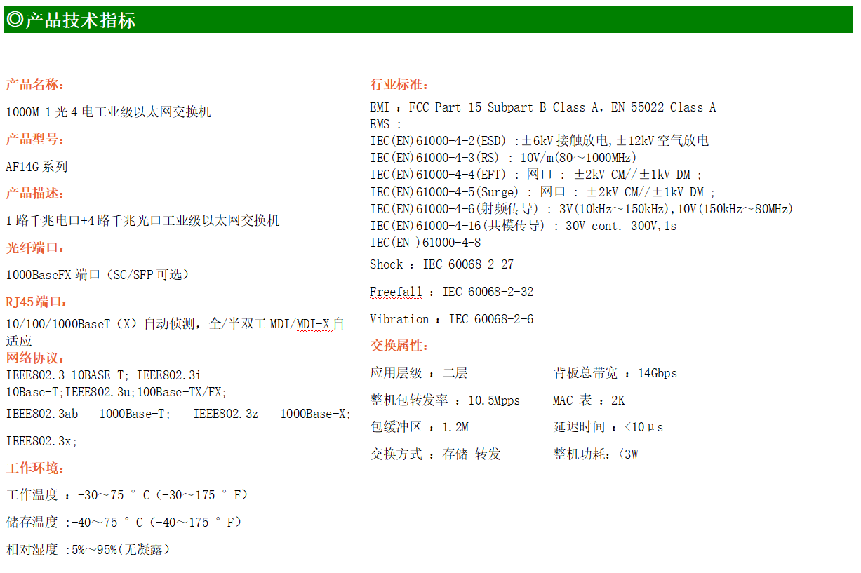 4路千兆電口+1路千兆FX光口工業(yè)級以太網(wǎng)交換機(jī),支持4個100Base-T/1000Base-TX電口和1個1000Base-X光口。產(chǎn)品符合FCC、CE、ROHS標(biāo)準(zhǔn)。AF14G系列交換機(jī)具有-30℃~75℃的工作溫度,具有超強(qiáng)的堅固度能適應(yīng)各種嚴(yán)苛環(huán)境,也可以非常方便的安置在空間緊湊的控制箱中。導(dǎo)軌的安裝特性、寬溫操作及擁有IP40防護(hù)等級的外殼及LED指示燈,使AF14G成為一個即插即用的工業(yè)級設(shè)備,為用戶的以太網(wǎng)設(shè)備聯(lián)網(wǎng)提供可靠、便捷的解決方案。