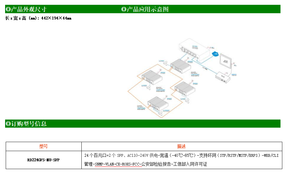 RD224GFSP-MU-AC-SFP是網管型工業(yè)以太網PoE交換機,產品符合FCC、CE、RoHS標準。可提供24個百兆PoE端口,所有PoE端口符合IEEE802.3af/at標準。支持工業(yè)現(xiàn)場所需的以太網二層協(xié)議,保證通信網絡的穩(wěn)定性;該系列交換機采用低功耗、無風扇設計,確保無噪聲干擾,同時支持-40~85℃工作溫度和良好的EMC電磁兼容性能,保證在惡劣的工業(yè)環(huán)境中保持穩(wěn)定的工作,為工廠自動化,智能交通,視頻監(jiān)控等工業(yè)應用領域組建快速穩(wěn)定的網絡終端接入網絡提供安全可靠的解決方案。