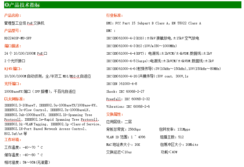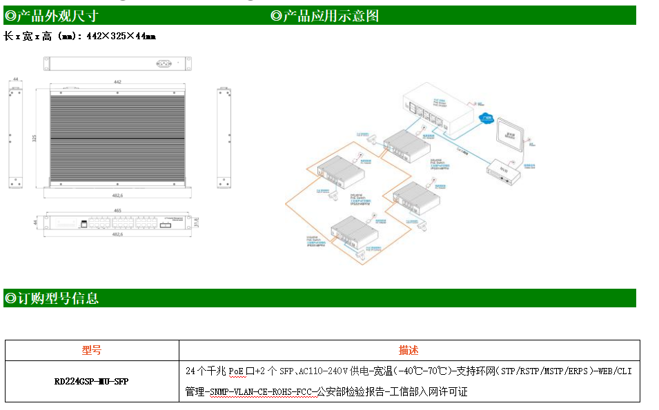 RD224GSP-MU-SFP是網管型工業以太網PoE交換機,產品符合FCC、CE、RoHS標準。可提供24個千兆PoE端口,所有PoE端口符合IEEE802.3af/at標準。支持工業現場所需的以太網二層協議,保證通信網絡的穩定性;該系列交換機采用低功耗、無風扇設計,確保無噪聲干擾,同時支持-40~70℃工作溫度和良好的EMC電磁兼容性能,保證在惡劣的工業環境中保持穩定的工作,為工廠自動化,智能交通,視頻監控等工業應用領域組建快速穩定的網絡終端接入網絡提供安全可靠的解決方案。