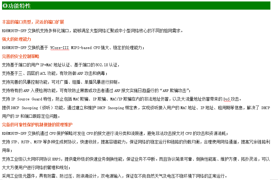 ●網絡冗余:支持STP/RSTP/MSTP,支持ERPS(自愈時間<20ms)