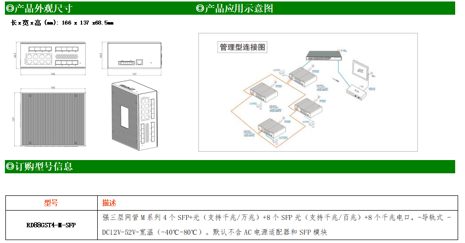 RD88GST4-M-SFP交換機是我司推出的一款萬兆三層交換機,配備4個萬兆SFP+光口、8個千兆SFP光口和8個10/100/1000M Base-T自適應電口,具備先進的硬件處理能力和最豐富的業務特性。支持IPv4/IPv6 硬件雙棧及線速轉發,使客戶能夠從容應對即將帶來的IPv6 時代其提供高容量的交換能力。RD88GST4-M-SFP交換機具有-40℃~80℃的工作溫度,具有超強的堅固度能適應各種嚴苛環境。導軌式安裝特性、寬溫操作,使RD48GST4-M-SFP的交換機成為一個即插即用的工業級設備,為用戶的以太網設備聯網提供可靠、便捷的解決方案。
