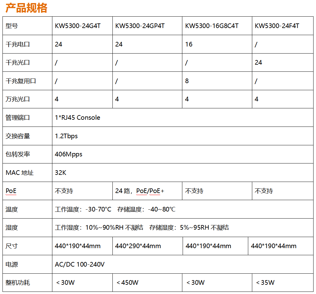 全新開(kāi)發(fā)推出的KW5300系列全千兆網(wǎng)管寬溫交換機(jī),采用新一代高性能硬件和軟件平臺(tái),提供靈活、高性價(jià)比的全千兆接入和上行端口,支持完備的安全防護(hù)機(jī)制、完善的ACL/QoS策略和靈活的VLAN功能,易于管理維護(hù),滿足用戶對(duì)于網(wǎng)絡(luò)設(shè)備易管理、高安全、高性能、低成本的組網(wǎng)需求,專(zhuān)為市政、銀行、教育、醫(yī)院、酒店、網(wǎng)吧、數(shù)據(jù)中心等室內(nèi)項(xiàng)目以及戶外新基建項(xiàng)目定制系列,能滿足大規(guī)模的市場(chǎng)需求。