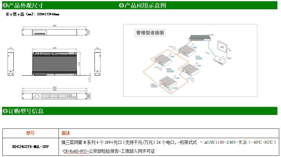 RD424GST4-MQL-SFP交換機是我司推出的一款萬兆三層交換機,配備4個萬兆SFP+光口和24個10/100/1000M Base-T自適應電口,具備先進的硬件處理能力和最豐富的業務特性。支持IPv4/IPv6 硬件雙棧及線速轉發,使客戶能夠從容應對即將帶來的IPv6 時代其提供高容量的交換能力。RD424GST4-MQL-SFP交換機具有-40℃~85℃的工作溫度,具有超強的堅固度能適應各種嚴苛環境。導軌式安裝特性、寬溫操作,使RD424GST4-MQL-SFP的交換機成為一個即插即用的工業級設備,為用戶的以太網設備聯網提供可靠、便捷的解決方案。