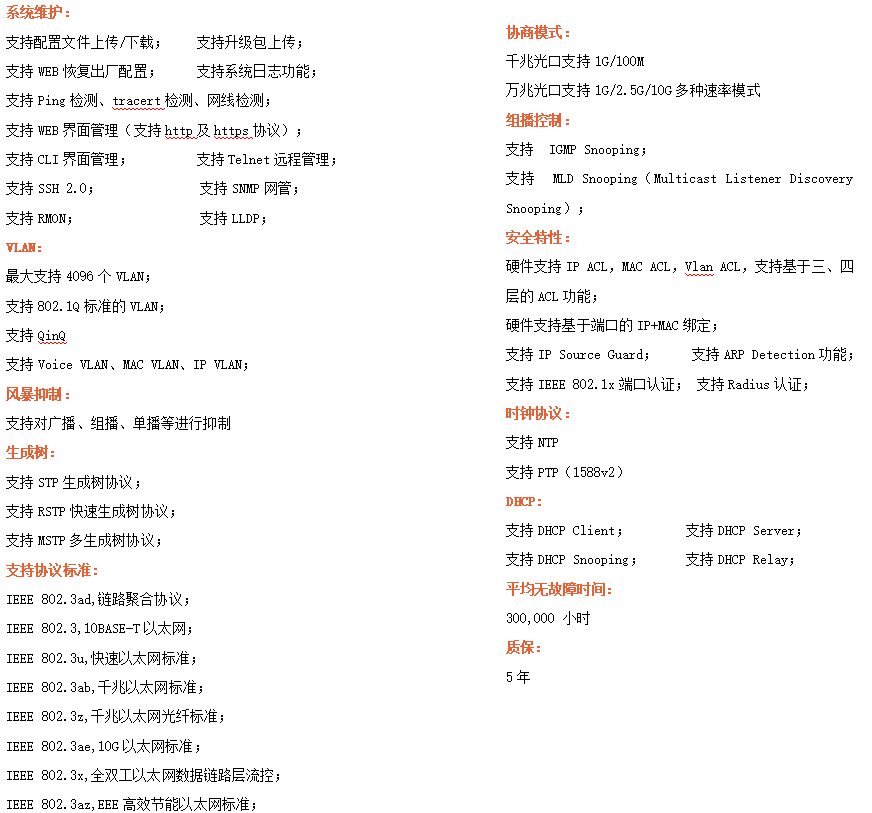 ●網(wǎng)絡(luò)冗余:支持STP/RSTP/MSTP,支持ERPS(自愈時(shí)間<20ms)