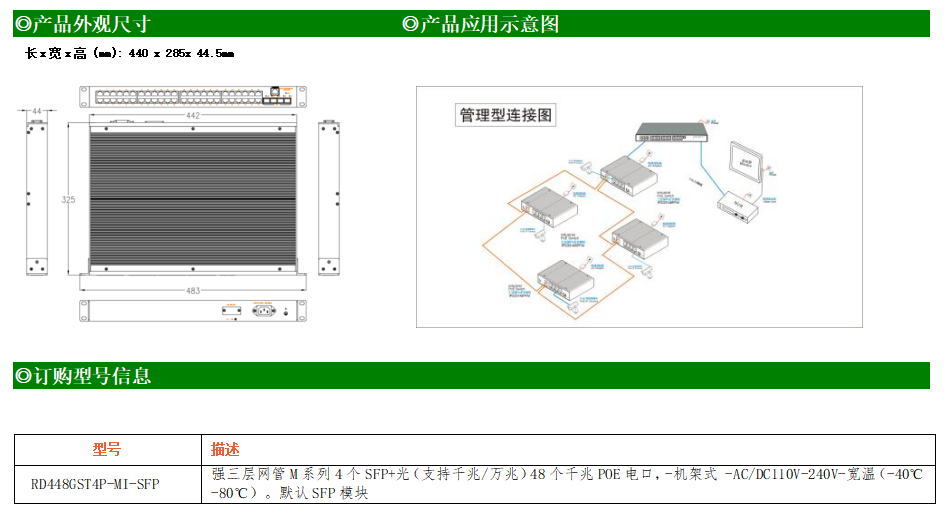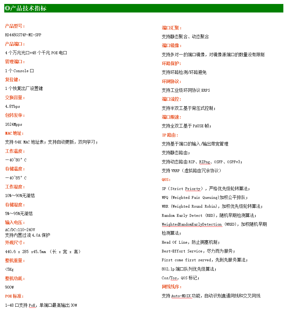 RD448GST4P-MI-SFP交換機是我司推出的一款萬兆三層交換機,配備4個萬兆SFP+光口和48個10/100/1000M Base-T自適應PoE端口,所有PoE端口符合IEEE802.3af/at標準,具備先進的硬件處理能力和最豐富的業務特性。支持IPv4/IPv6 硬件雙棧及線速轉發,使客戶能夠從容應對即將帶來的IPv6 時代其提供高容量的交換能力。RD448GST4P-MI-SFP交換機具有-40℃~85℃的工作溫度,具有超強的堅固度能適應各種嚴苛環境,使RD448GST4P-MI-SFP的交換機成為一個即插即用的工業級設備,為用戶的以太網設備聯網提供可靠、便捷的解決方案。