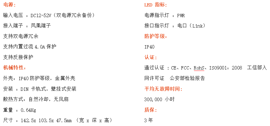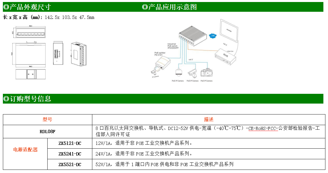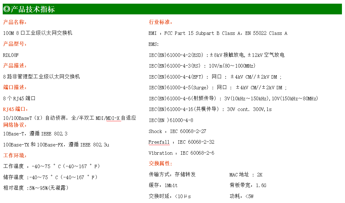8路百兆電口工業級以太網交換機,支持8個10Base-T/100Base-TX電口。產品符合FCC、CE、ROHS標準。RDL08F交換機具有-40℃~75℃的工作溫度,具有超強的堅固度能適應各種嚴苛環境,也可以非常方便的安置在空間緊湊的控制箱中。導軌的安裝特性、寬溫操作及擁有IP40防護等級的外殼及LED指示燈,使RDL08F成為一個即插即用的工業級設備,為用戶的以太網設備聯網提供可靠、便捷的解決方案。