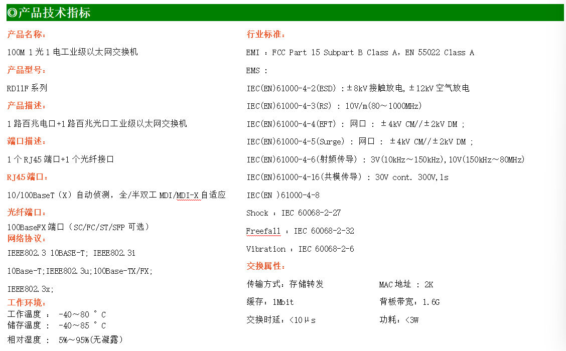 1路百兆電口+1路百兆FX光口工業級以太網交換機,支持1個10Base-T/100Base-TX電口和1個100Base-X光口。產品符合FCC、CE、ROHS標準。RD11F系列交換機具有-40℃~80℃的工作溫度,具有超強的堅固度能適應各種嚴苛環境,也可以非常方便的安置在空間緊湊的控制箱中。導軌的安裝特性、寬溫操作及擁有IP40防護等級的外殼及LED指示燈,使RD11F成為一個即插即用的工業級設備,為用戶的以太網設備聯網提供可靠、便捷的解決方案。