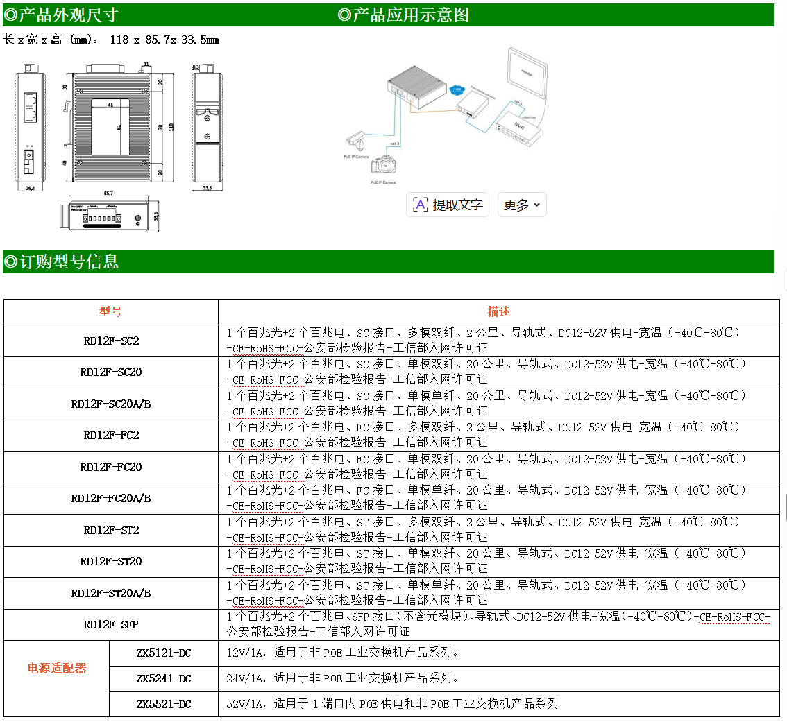 2路百兆電口+1路百兆FX光口工業級以太網交換機,支持2個10Base-T/100Base-TX電口和1個100Base-X光口。產品符合FCC、CE、ROHS標準。RD12F系列交換機具有-40℃~80℃的工作溫度,具有超強的堅固度能適應各種嚴苛環境,也可以非常方便的安置在空間緊湊的控制箱中。導軌的安裝特性、寬溫操作及擁有IP40防護等級的外殼及LED指示燈,使RD12F成為一個即插即用的工業級設備,為用戶的以太網設備聯網提供可靠、便捷的解決方案。