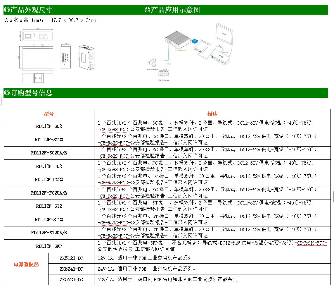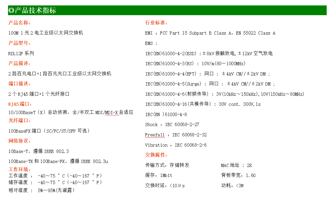 2路百兆電口+1路百兆FX光口工業(yè)級以太網(wǎng)交換機(jī),支持2個(gè)10Base-T/100Base-TX電口和1個(gè)100Base-X光口。產(chǎn)品符合FCC、CE、ROHS標(biāo)準(zhǔn)。RDL12F系列交換機(jī)具有-40℃~75℃的工作溫度,具有超強(qiáng)的堅(jiān)固度能適應(yīng)各種嚴(yán)苛環(huán)境,也可以非常方便的安置在空間緊湊的控制箱中。導(dǎo)軌的安裝特性、寬溫操作及擁有IP40防護(hù)等級的外殼及LED指示燈,使RDL12F成為一個(gè)即插即用的工業(yè)級設(shè)備,為用戶的以太網(wǎng)設(shè)備聯(lián)網(wǎng)提供可靠、便捷的解決方案。