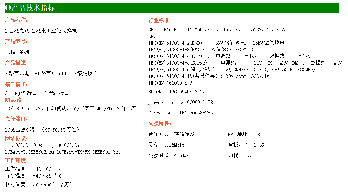 8路百兆電口+1路百兆FX光口工業(yè)級(jí)以太網(wǎng)交換機(jī),支持8個(gè)10/100Base-TX電口和1個(gè)100Base-X光口。產(chǎn)品符合FCC、CE、ROHS標(biāo)準(zhǔn)。RD18F交換機(jī)具有-40℃~80℃的工作溫度,具有超強(qiáng)的堅(jiān)固度能適應(yīng)各種嚴(yán)苛環(huán)境,也可以非常方便的安置在空間緊湊的控制箱中。導(dǎo)軌的安裝特性、寬溫操作及擁有IP40防護(hù)等級(jí)的外殼及LED指示燈,使RD18F成為一個(gè)即插即用的工業(yè)級(jí)設(shè)備,為用戶的以太網(wǎng)設(shè)備聯(lián)網(wǎng)提供可靠、便捷的解決方案。