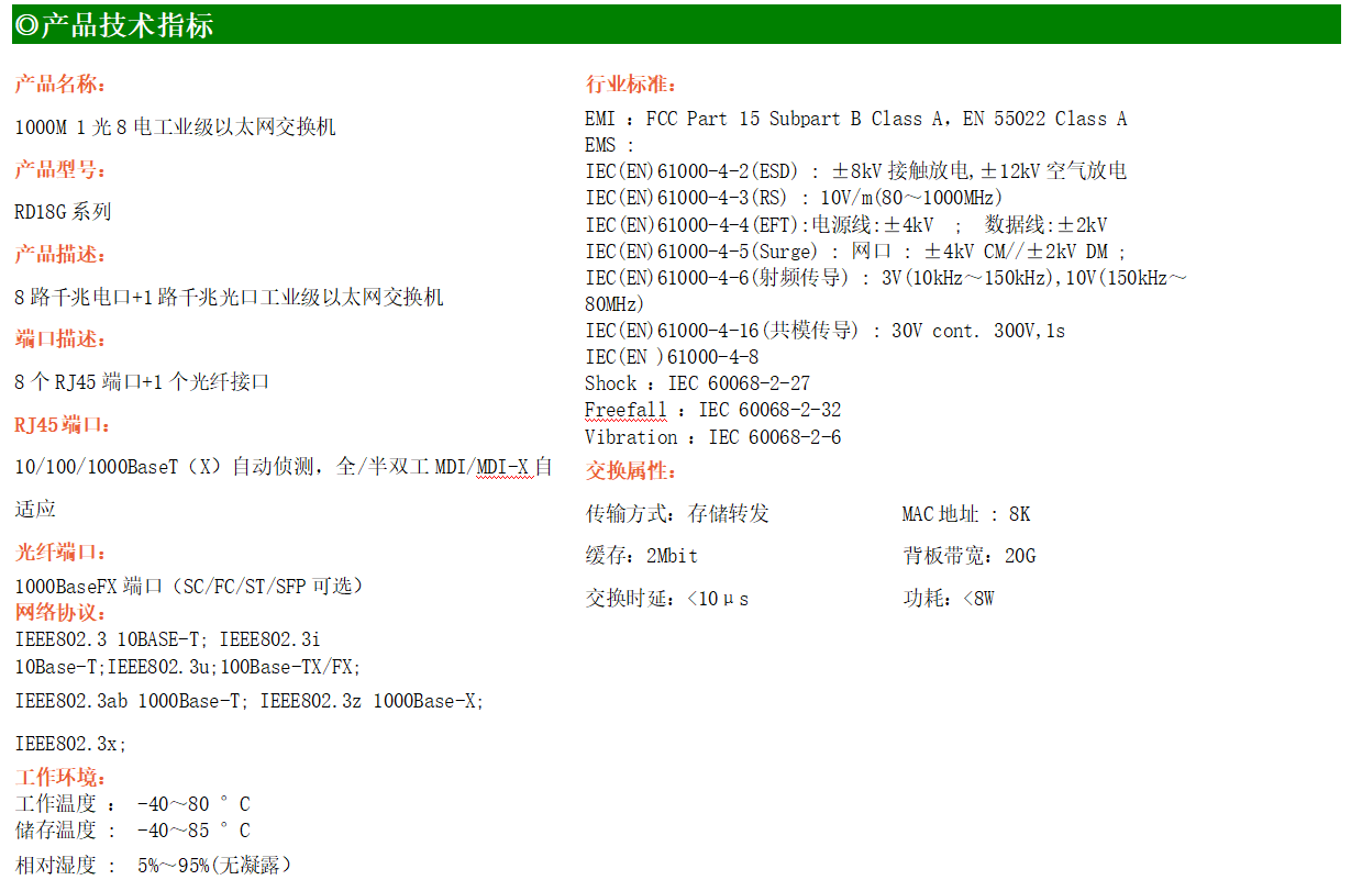 8路千兆電口+1路千兆FX光口工業(yè)級以太網交換機,支持8個100Base-T/1000Base-TX電口和1個1000Base-X光口。產品符合FCC、CE、ROHS標準。RD18G系列交換機具有-40℃~80℃的工作溫度,具有超強的堅固度能適應各種嚴苛環(huán)境,也可以非常方便的安置在空間緊湊的控制箱中。導軌的安裝特性、寬溫操作及擁有IP40防護等級的外殼及LED指示燈,使RD18G系列成為一個即插即用的工業(yè)級設備,為用戶的以太網設備聯(lián)網提供可靠、便捷的解決方案。