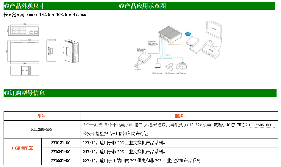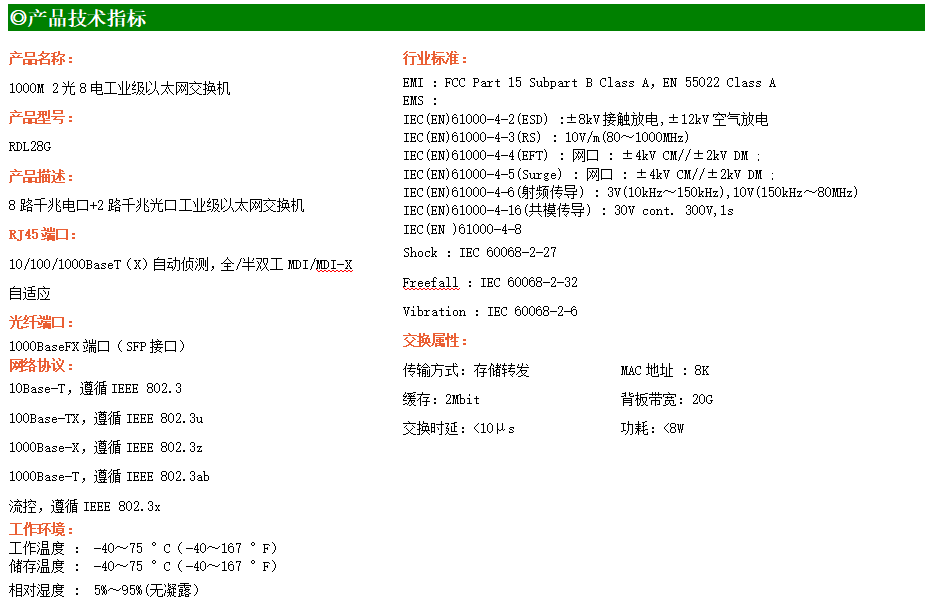 8路千兆電口+2路千兆FX光口工業(yè)級以太網(wǎng)交換機,支持8個100Base-T/1000Base-TX電口和2個1000Base-X光口。產(chǎn)品符合FCC、CE、ROHS標準。RDL28G交換機具有-40℃~75℃的工作溫度,具有超強的堅固度能適應各種嚴苛環(huán)境,也可以非常方便的安置在空間緊湊的控制箱中。導軌的安裝特性、寬溫操作及擁有IP40防護等級的外殼及LED指示燈,使RDL28G成為一個即插即用的工業(yè)級設備,為用戶的以太網(wǎng)設備聯(lián)網(wǎng)提供可靠、便捷的解決方案。