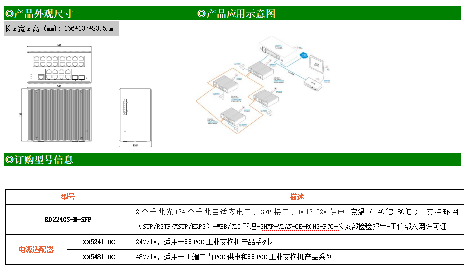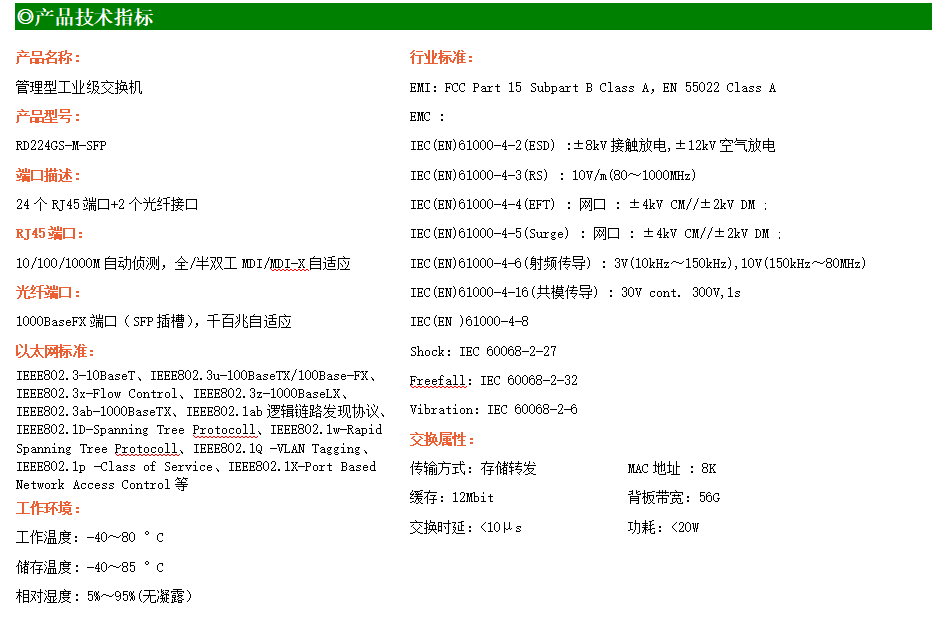 RD224GS-M-SFP是網管型工業以太網交換機,產品符合FCC、CE、RoHS標準。支持2個千兆光口和24個千兆電口;支持工業現場所需的以太網二層協議,保證通信網絡的穩定性;該系列交換機采用低功耗、無風扇設計,確保無噪聲干擾,同時支持-40~85℃工作溫度和良好的EMC電磁兼容性能,保證在惡劣的工業環境中保持穩定的工作,為工廠自動化,智能交通,視頻監控等工業應用領域組建快速穩定的網絡終端接入網絡提供安全可靠的解決方案。