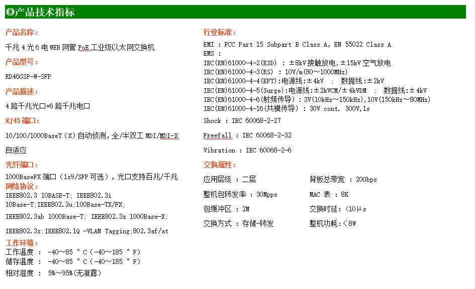 RD46GSP-W-SC20系列WEB網(wǎng)管工業(yè)級(jí)以太網(wǎng)交換機(jī),產(chǎn)品符合FCC、CE、ROHS標(biāo)準(zhǔn),支持工業(yè)現(xiàn)場(chǎng)所需的以太網(wǎng)二層協(xié)議,保證通信網(wǎng)絡(luò)的穩(wěn)定性。該系列交換機(jī)采用低功耗、無(wú)風(fēng)扇設(shè)計(jì),確保無(wú)噪聲干擾,同時(shí)支持-40~85℃工作溫度和良好的EMC電磁兼容性能,保證在惡劣的工業(yè)環(huán)境中保持穩(wěn)定的工作,為工廠自動(dòng)化,智能交通,視頻監(jiān)控等工業(yè)應(yīng)用領(lǐng)域組建快速穩(wěn)定的網(wǎng)絡(luò)終端接入網(wǎng)絡(luò)提供安全可靠的解決方案。