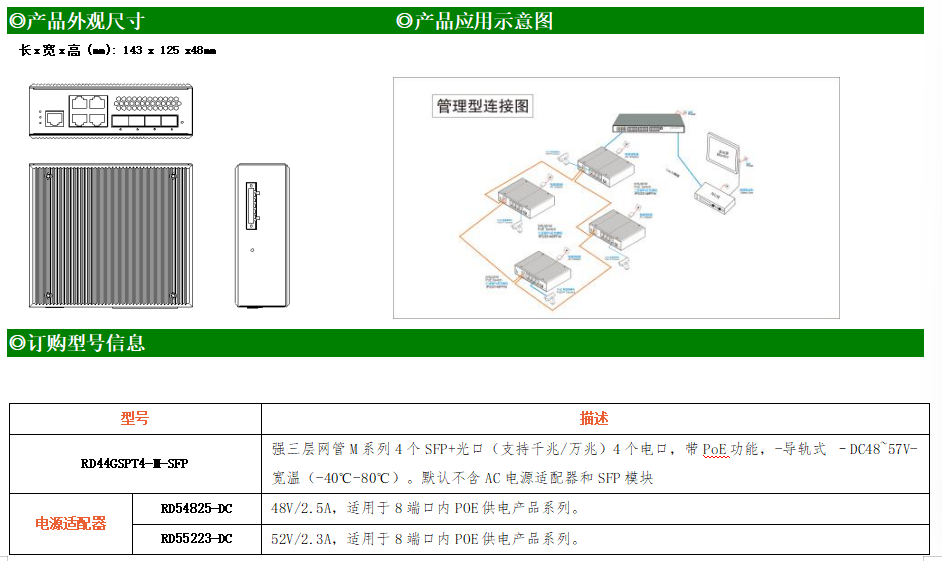 RD44GSPT4-M-SFP交換機是我司推出的一款萬兆三層工業(yè)級PoE交換機,配備4個SFP+光口和4個10/100/1000M Base-T自適應(yīng)電口支持4路PoE,具備先進的硬件處理能力和最豐富的業(yè)務(wù)特性。支持IPv4/IPv6 硬件雙棧及線速轉(zhuǎn)發(fā),使客戶能夠從容應(yīng)對即將帶來的IPv6 時代其提供高容量的交換能力。該系列交換機采用低功耗、無風(fēng)扇設(shè)計,確保無噪聲干擾,同時支持-40~80℃工作溫度和良好的EMC電磁兼容性能,保證在惡劣的工業(yè)環(huán)境中保持穩(wěn)定的工作,為工廠自動化,智能交通,視頻監(jiān)控等工業(yè)應(yīng)用領(lǐng)域組建快速穩(wěn)定的網(wǎng)絡(luò)終端接入網(wǎng)絡(luò)提供安全可靠的解決方案。